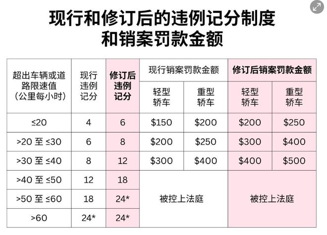 根据不同车型以及超出的限速值,修订后的销案罚款金额将调高50新至150新不等;违例记分则将提高两分到六分不等。如下图所示: